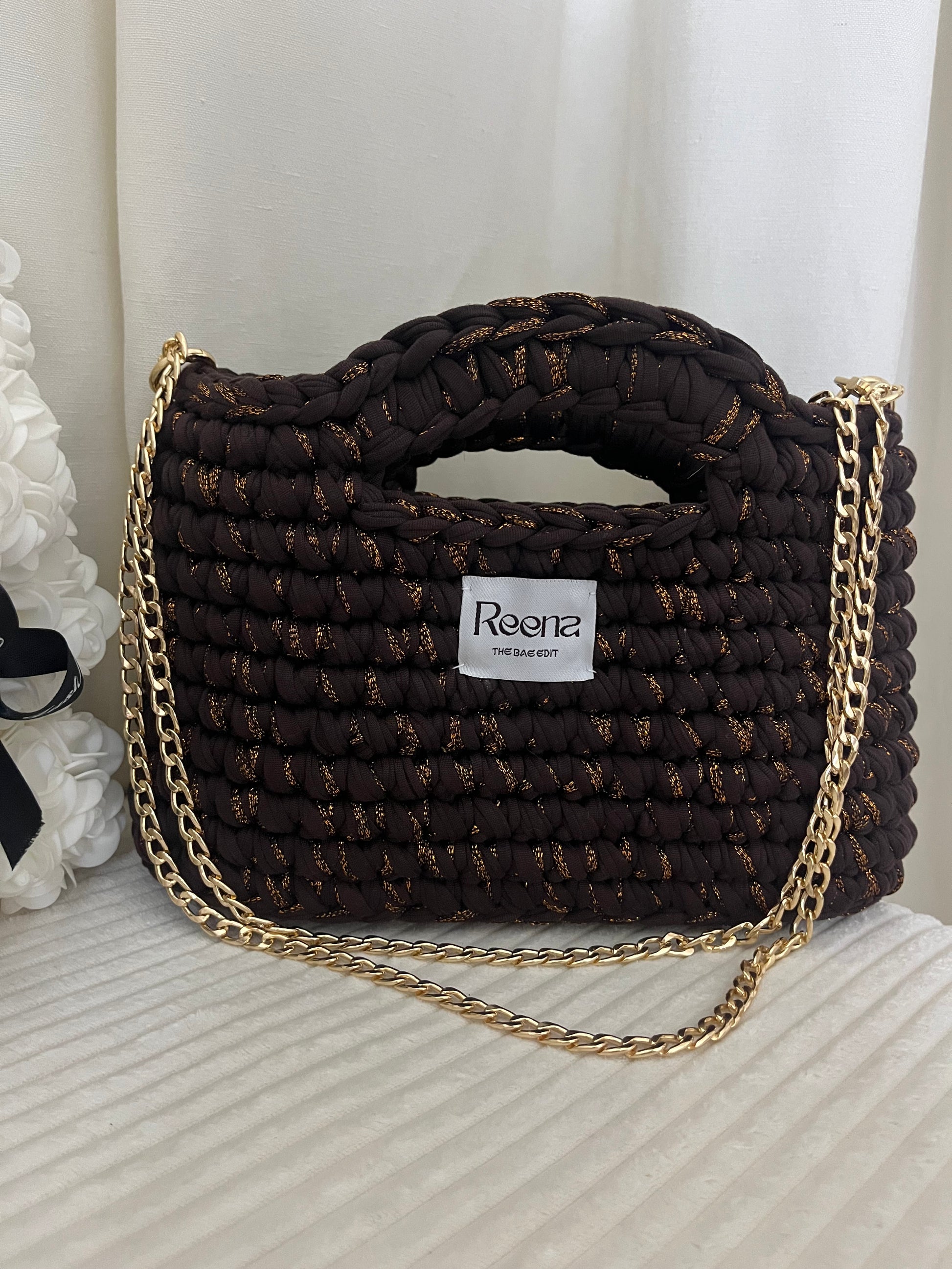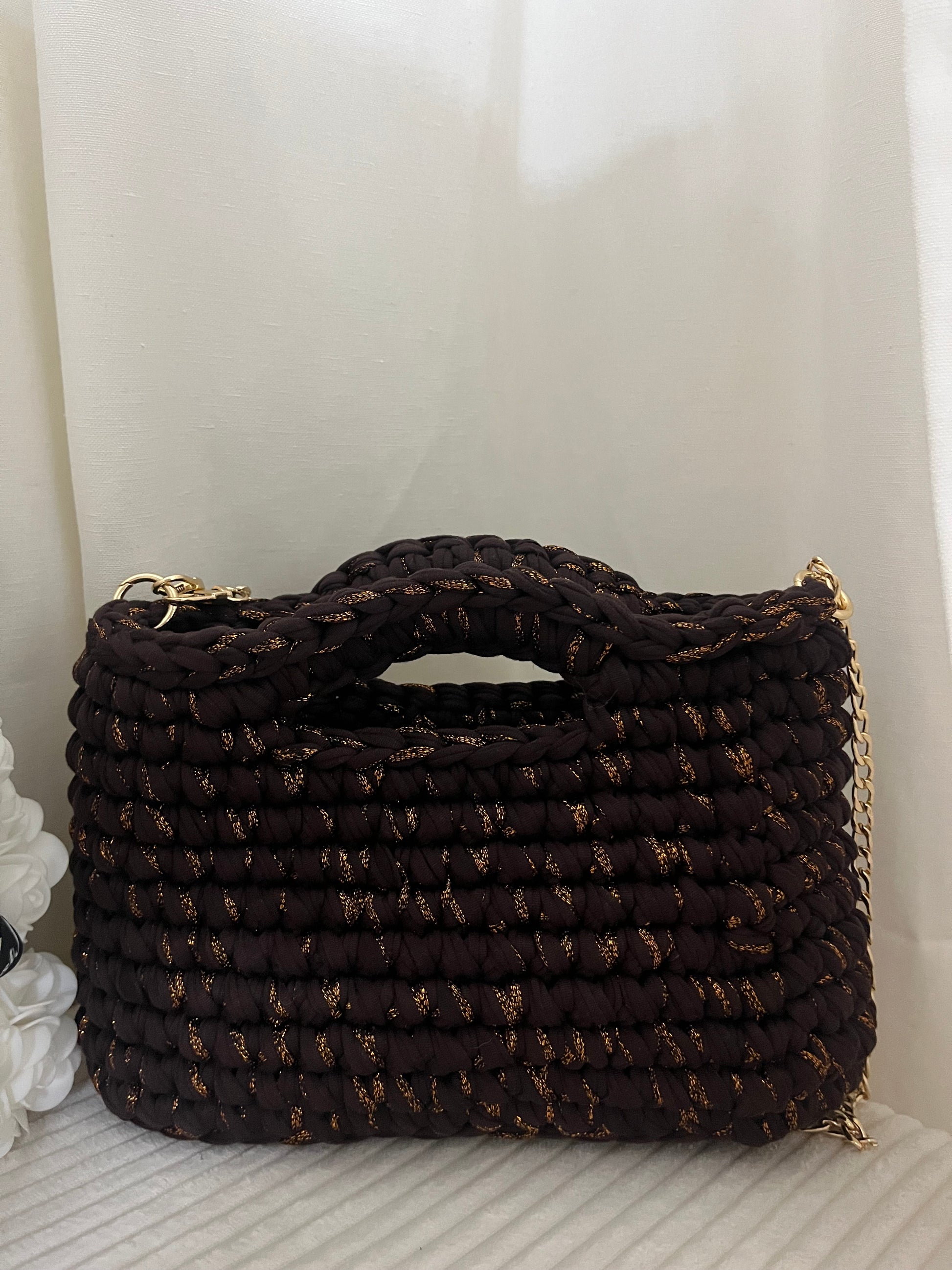 L’élégance chaleureuse du marron foncé sublimé par des fils pailletés dorés.